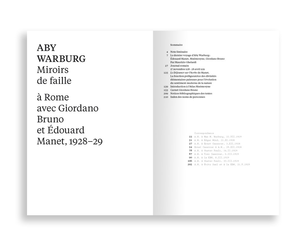 Les derniers textes romains d'Aby Warburg constituent, selon les propres mots de leur auteur, une « seconde période créatrice ». Réunis sous le titre Miroirs de faille. À Rome avec Giordano Bruno et Édouart Manet , 1928-1929, ceux-ci composent le premier ouvrage d’une collection créée par les éditions L’écarquillé et consacrée à l’historien d’art allemand – preuve, s’il en était encore besoin, de l’actualité comme du rayonnement de l’homme et de sa pensée. Cette nouvelle publication de ses écrits en français contient le journal que Warburg écrivit durant un séjour à Rome avec son assistante, Gertrud Bing, entre l’automne 1928 et le printemps 1929 – l’année même de sa mort. Faisant retour sur les sujets et travaux des décennies précédentes (les survivances de l’antiquité païenne dans l’art et la pensée de la Renaissance, la fonction « mnémonique » de motifs iconographiques de la chute et de l’ascension) ce voyage en Italie devait aussi, pensait-il, offrir aux jeunes générations d’historiens des pistes méthodologiques renouvelées, dans la lignée de son iconologie des « intervalles ». C’est du reste avec prescience qu’il envisageait à cette même période un destin fructueux aux efforts entrepris ; de fait, la grande vitalité des études warburgiennes (et l’héritage spirituel revendiqué par certains historiens de l’art aujourd’hui) lui donne raison. Ce qu’il nomma sa « fenaison sous l’orage » – l’internement psychiatrique de Kreuzlingen n’était pas si loin – était aussi destiné à enrichir l’Atlas Mnémosyne, montage et cartographie visuelle de l’expressivité (des « engrammes ordonnés », disait Warburg), pour lequel il écrivit une introduction, publiée dans cet ouvrage. Celui-ci contient plusieurs textes : le Journal de la Kulturwissenschaftliche Bibliothek Warburg (souvent raccourci par son auteur en « KBW ») est le résultat de réflexions croisées avec Bing ; les lettres envoyées à l’équipe de la KBW – les historiens d’art Fritz Saxl et Edgar Wind – s’insèrent dans le cours du journal, en faisant état de l’avancement des recherches et de l’importance que Warburg leur attribuait.